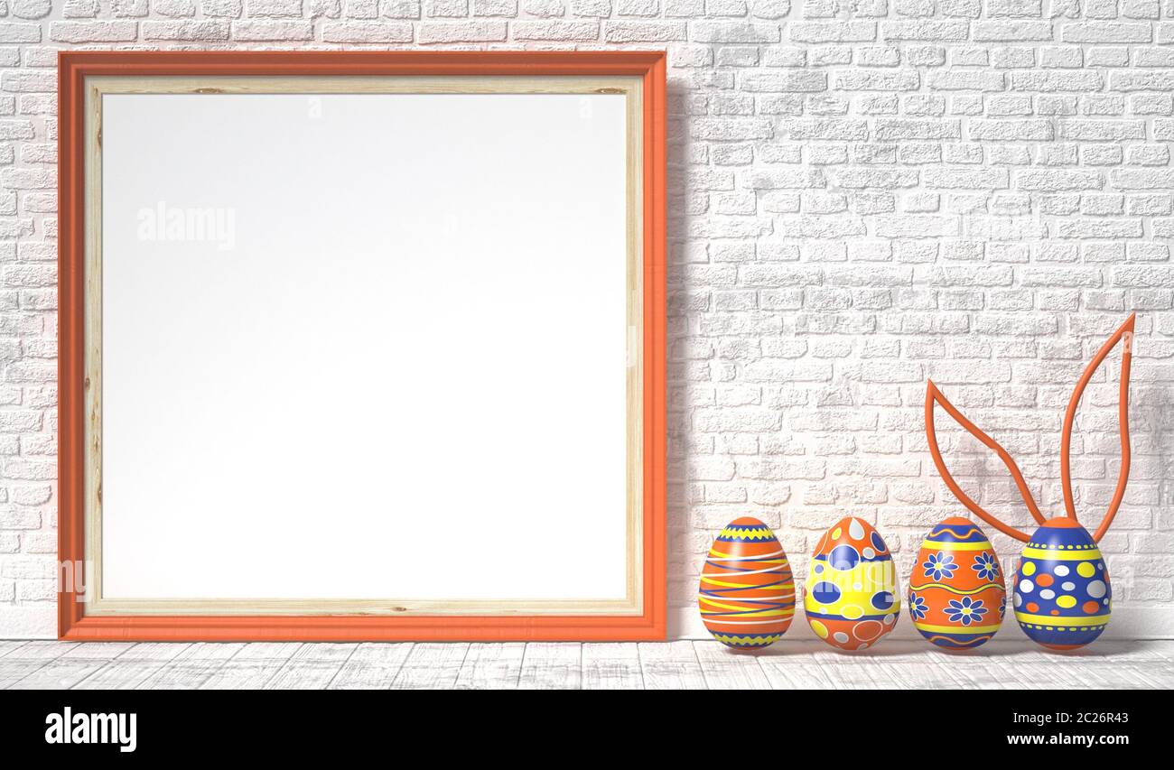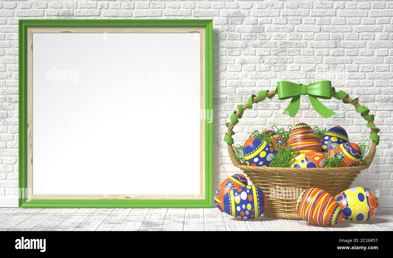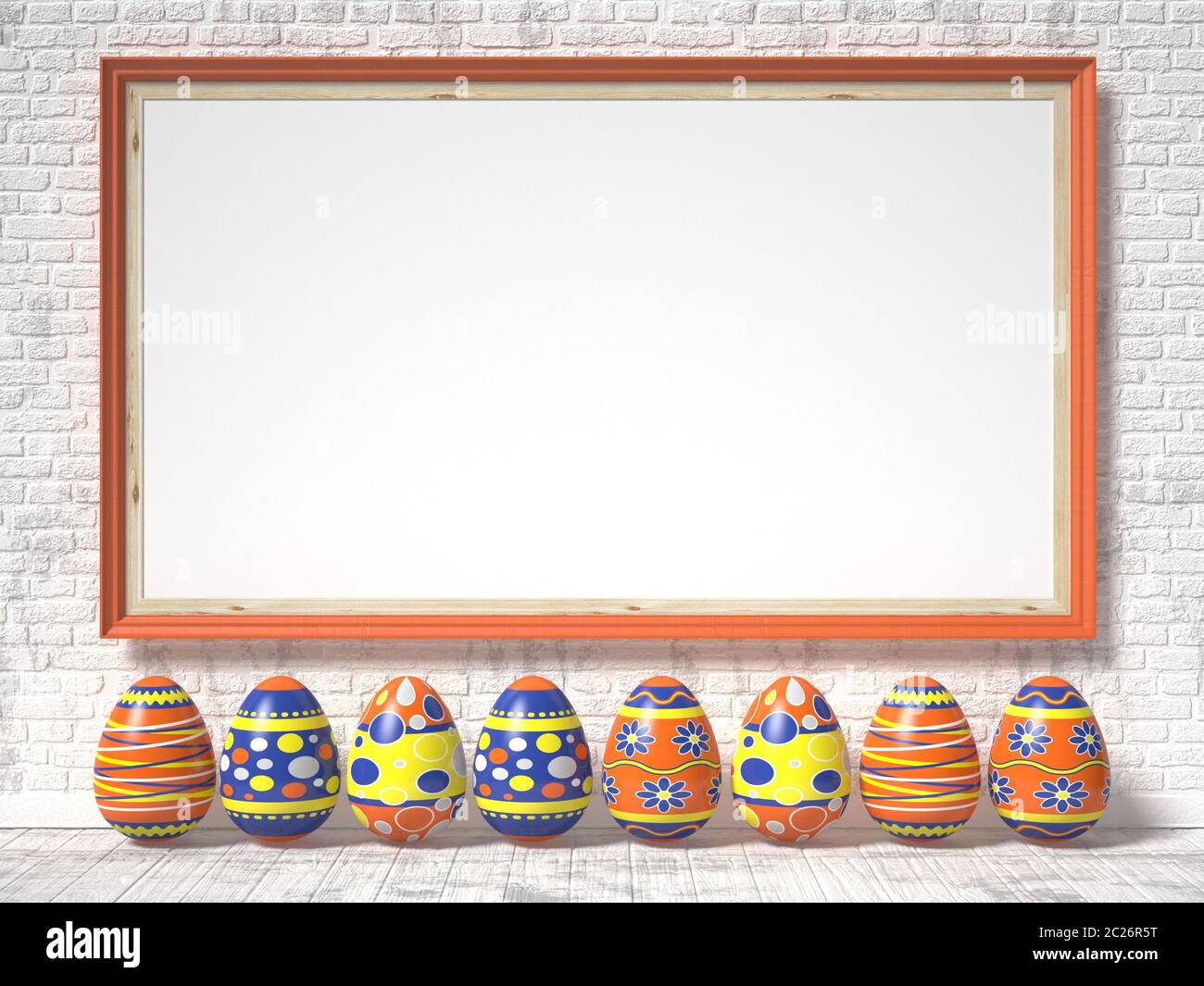 Easter eggs painted and blank picture frame Easter concept 3D Stock