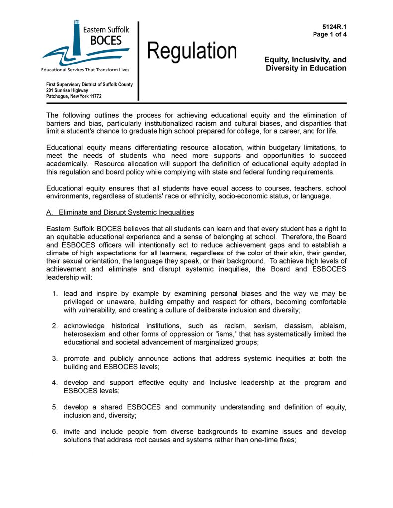 Regulation 5124R 1 Equity Inclusivity and Diversity in Education