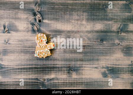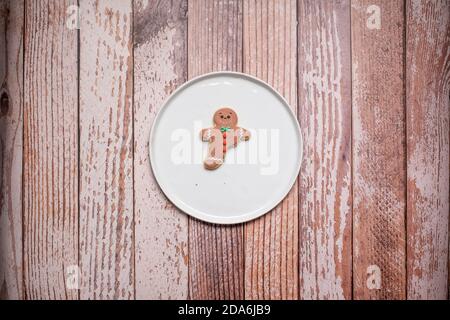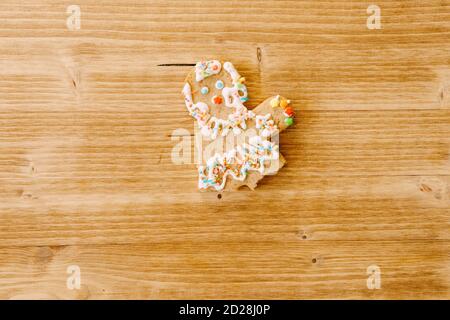 Partially eaten Christmas gingerbread man cookie on a textured wood