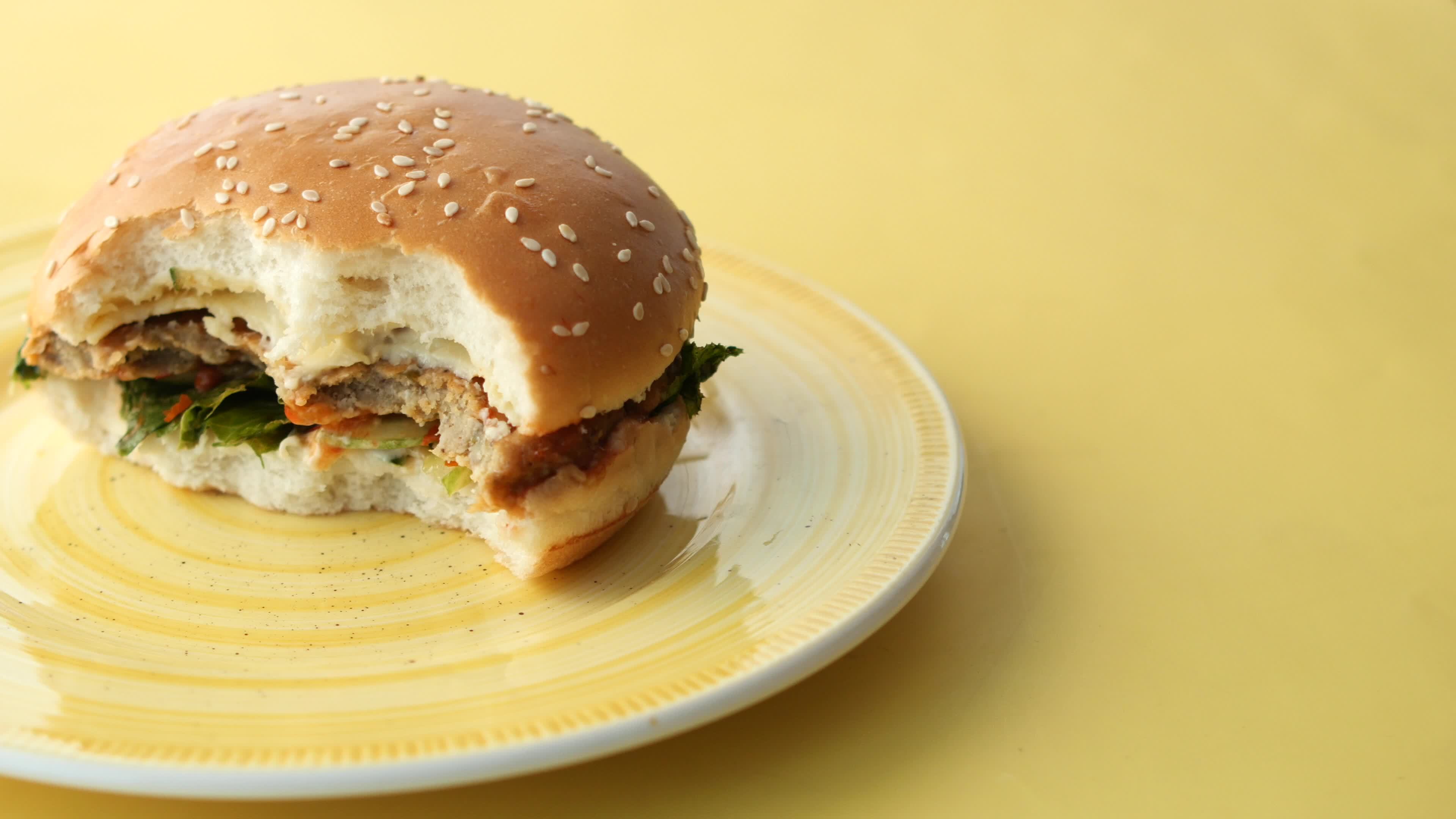 A half eaten burger on yellow plate 14180074 Stock Video at Vecteezy