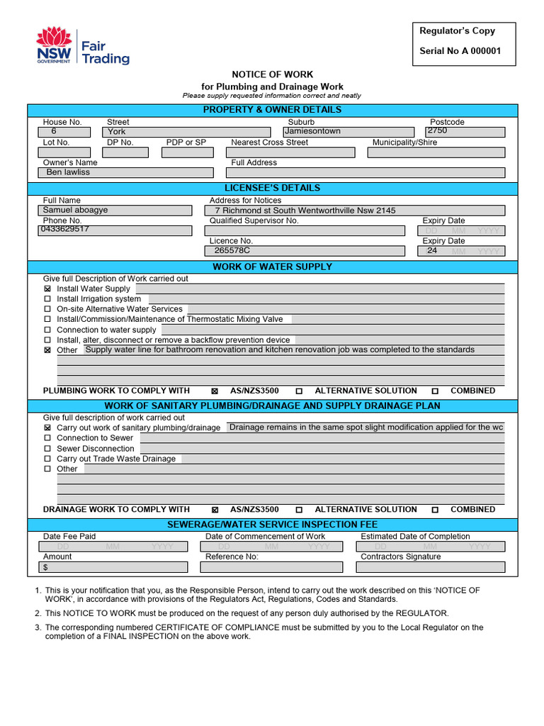 Combined Notice of Work and Certificate of Compliance PDF Sanitary