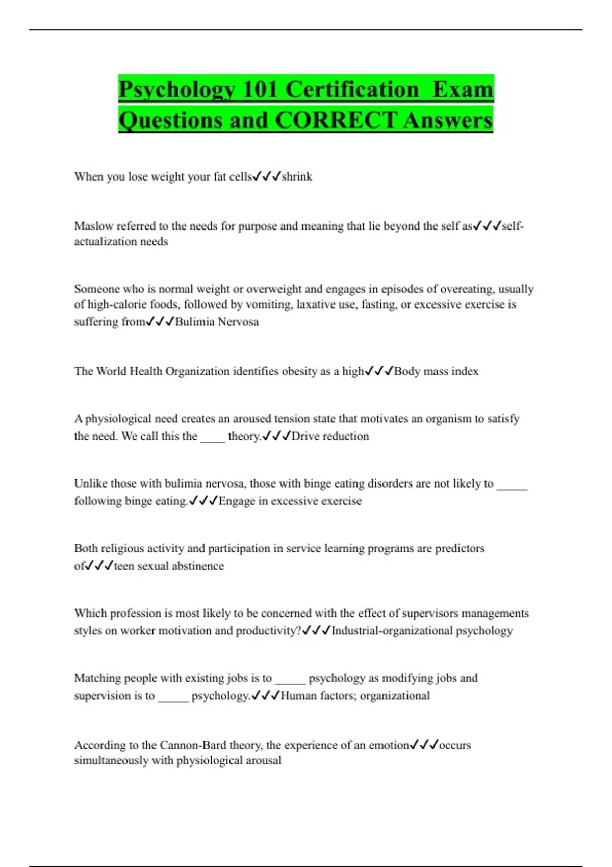 Psychology 101 Certification Exam Questions and CORRECT Answers