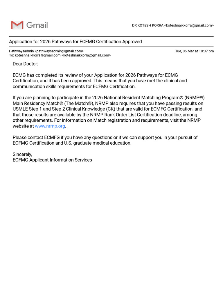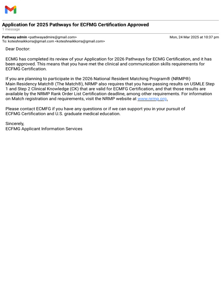Gmail Application For 2025 Pathways For ECFMG Certification Approved