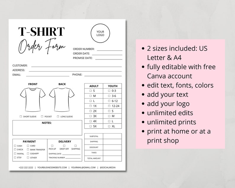 Editable T shirt Order Form Template Printable Small Business Etsy