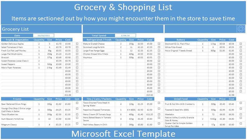 Editable Grocery List Template Microsoft Excel Spreadsheet