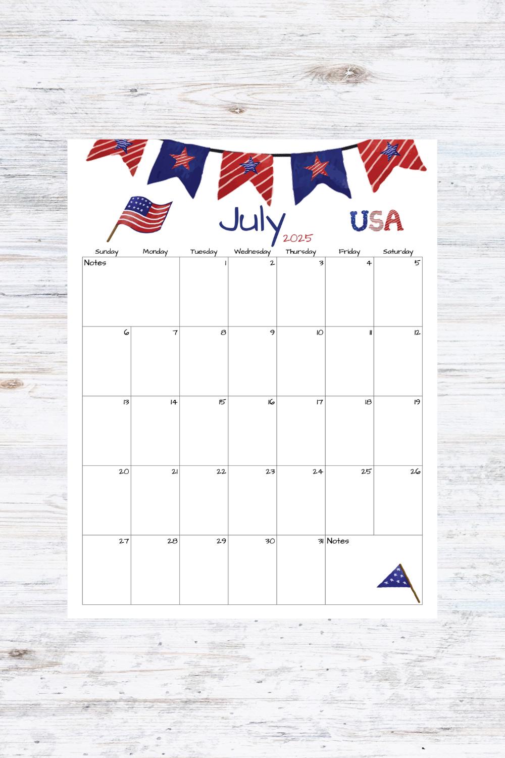 Download Free Editable Calendar July 2025 With Notes weeks start on Sunday