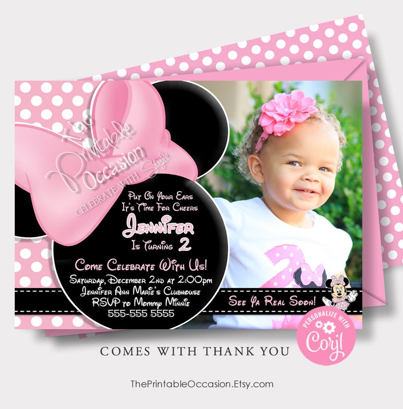 Paper Minnie Mouse First Birthday Invitation Girl Photo Picture Pink