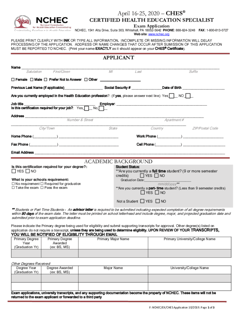 Fillable Online NCHEC: Health Education Specialist Certification CHES