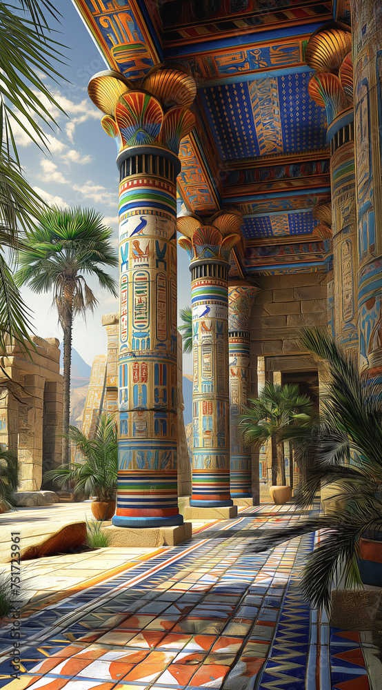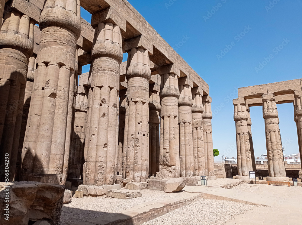 Ruins of an ancient egyptian temple with columns full of hieroglyphs in