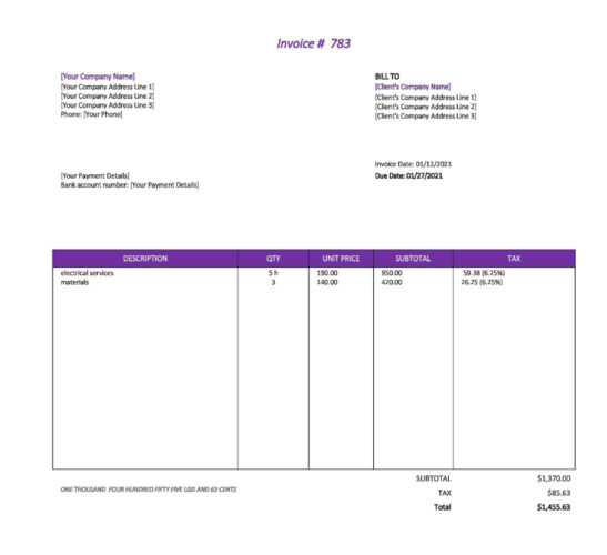 Electrician Invoice Template Free Template 1 : Resume Examples #