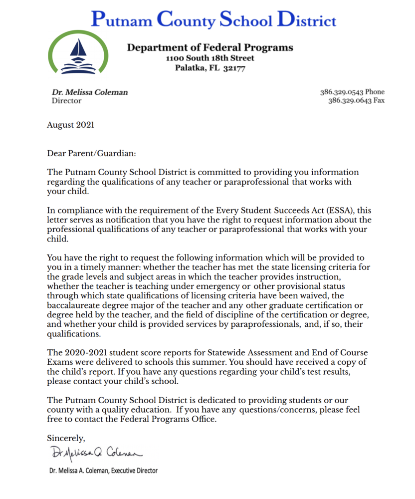 2021 2022 Teacher Certification Letter James A Long Elementary School