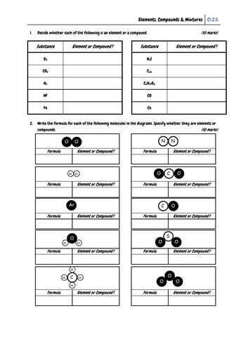 Elements Compounds Mixtures Worksheet Teaching Resources