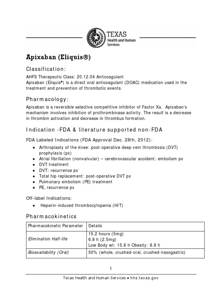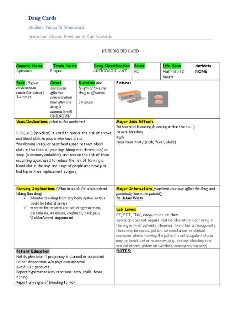 Anticoagulant Medication Template: Apixaban (Eliquis) Dosage Course Hero