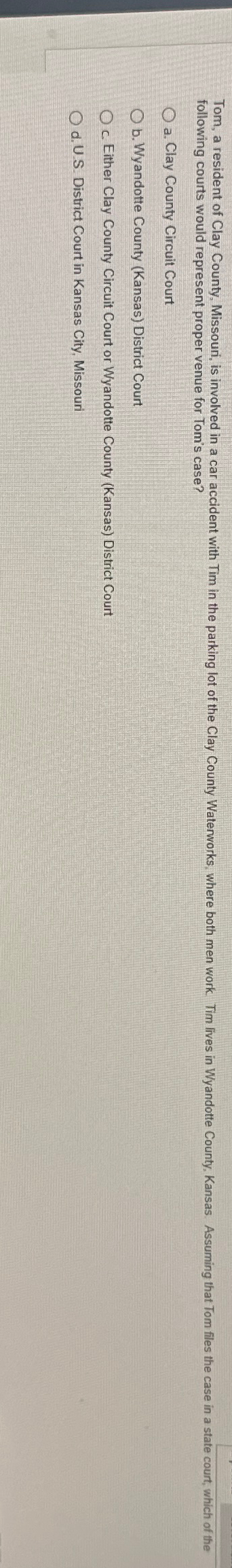 Solved Tom a resident of Clay County Missouri is involved Chegg com