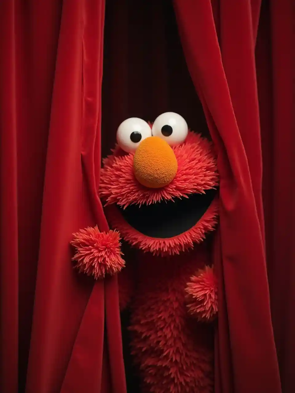 Apariencia juguetona de Elmo detrás de la cortina roja