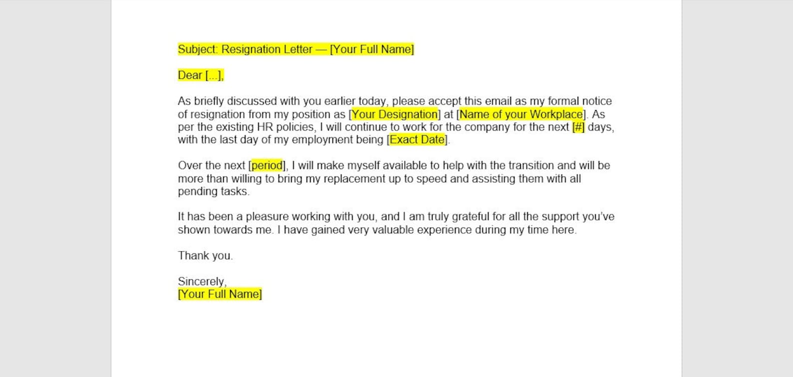 Free Resignation Email Letter Template to Edit Online