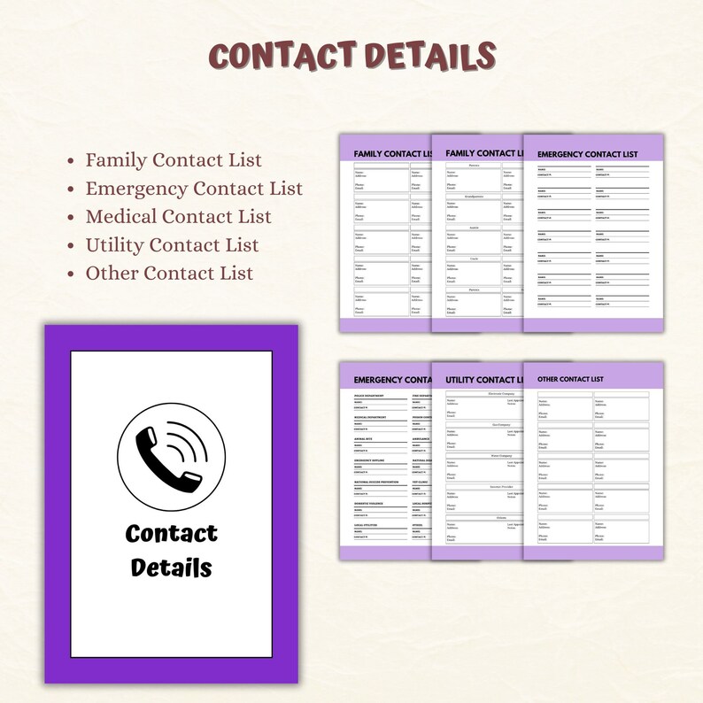 Digital Address Book: Printable Contact List Emergency Log (canva