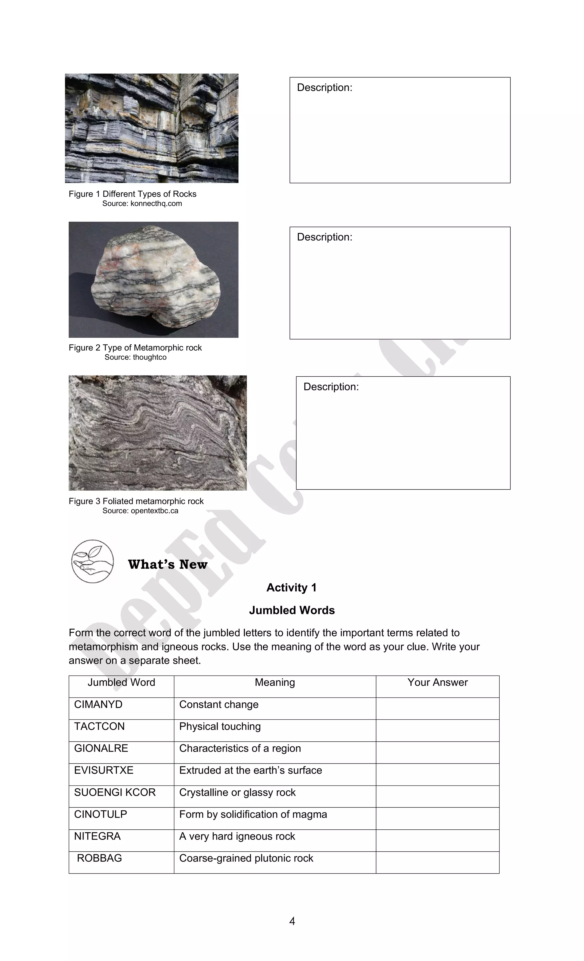 Earth and Life Science Quarter 1 Module 4: Rocks Activity Answer