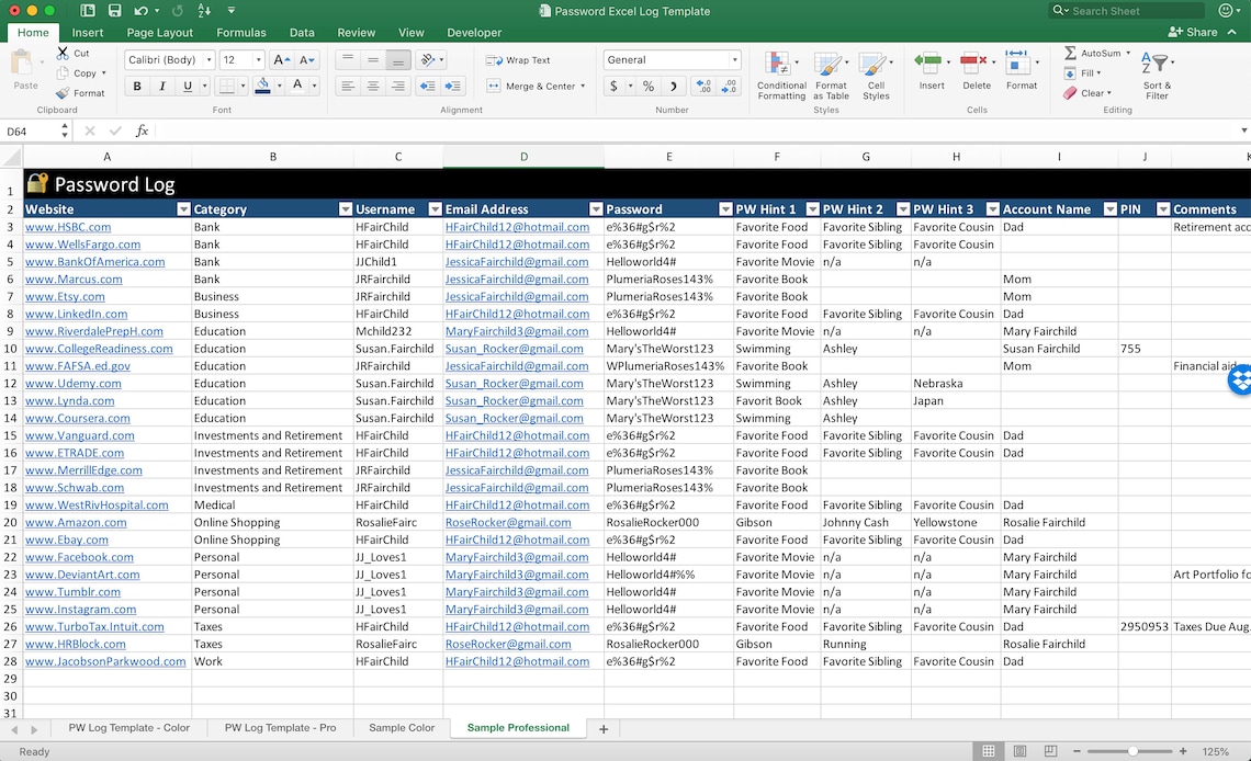 Colorful Password Log Excel Template / Instant Digital Download Etsy