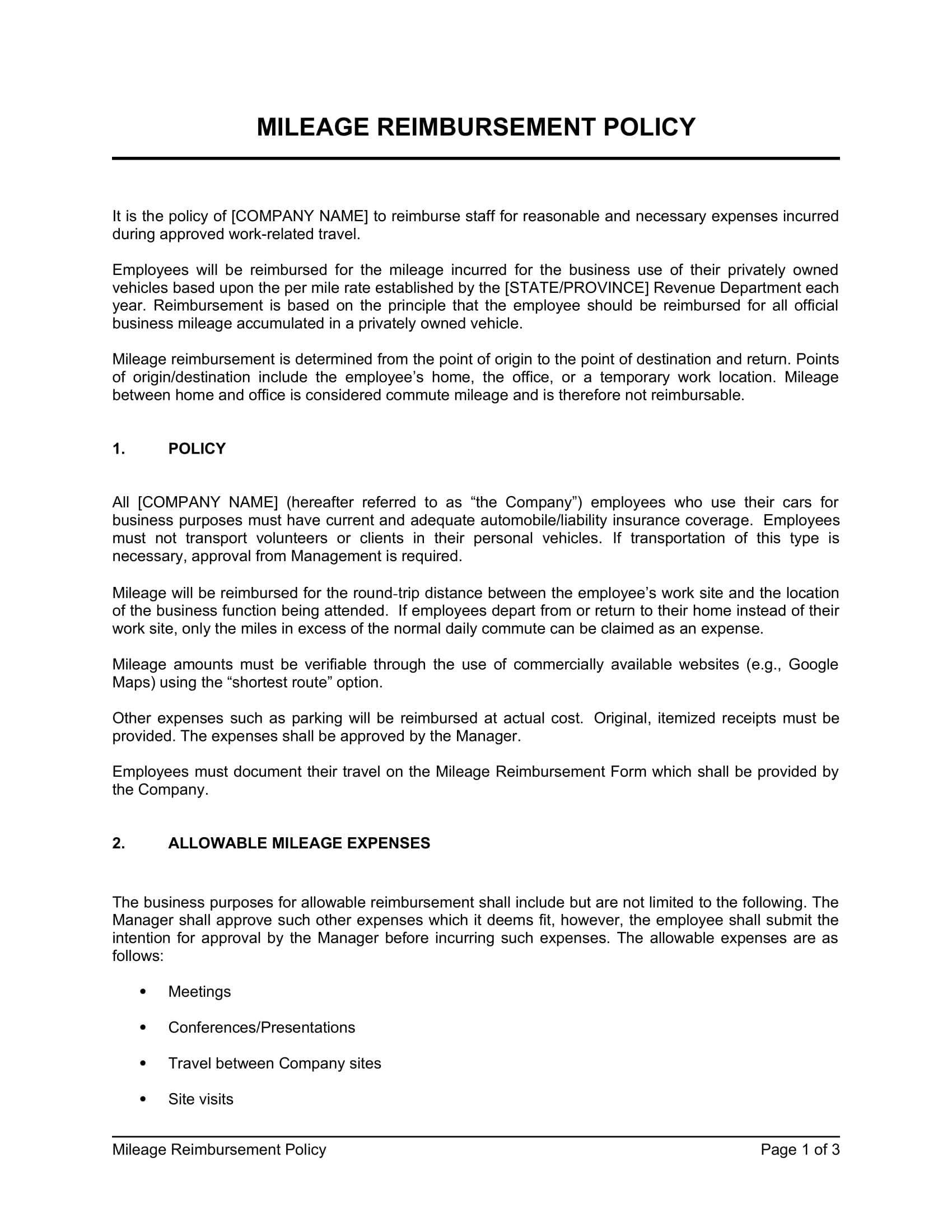 Mileage Reimbursement Policy Template (Word PDF) Free Trial