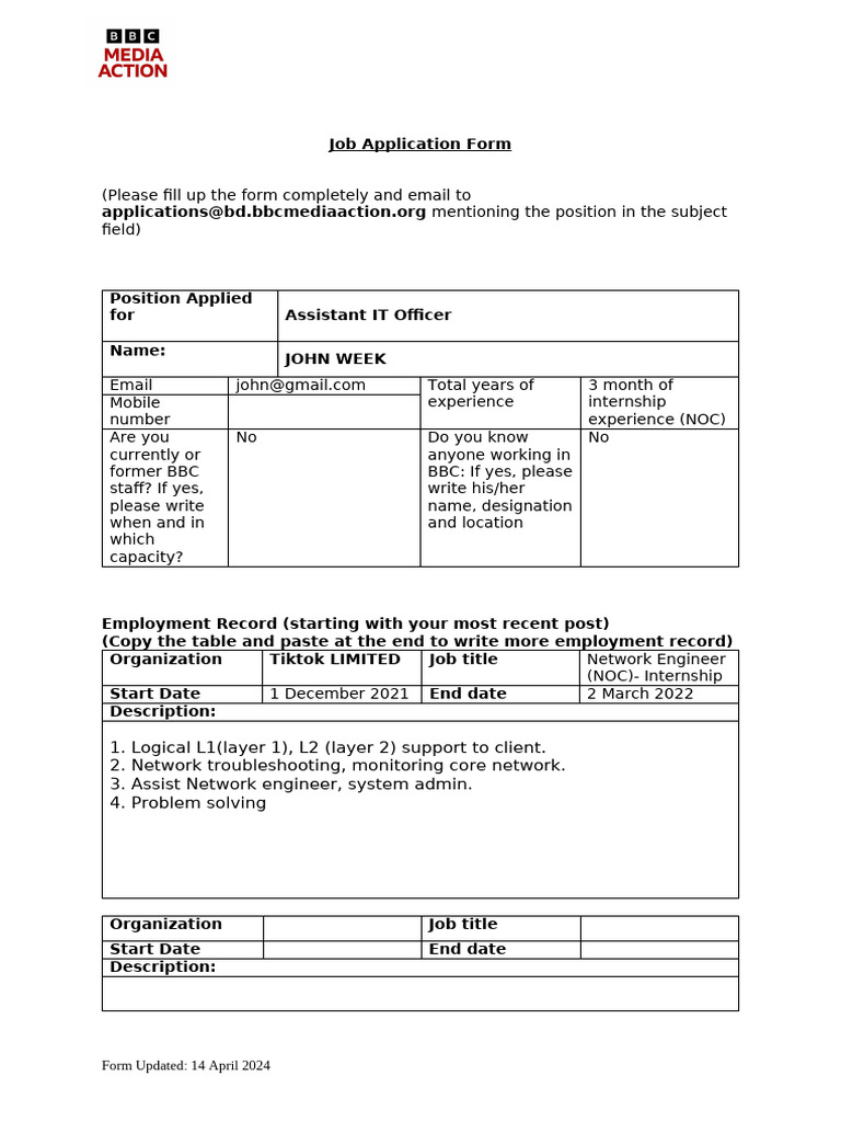 Practice Job Application Form Job application form Printable job
