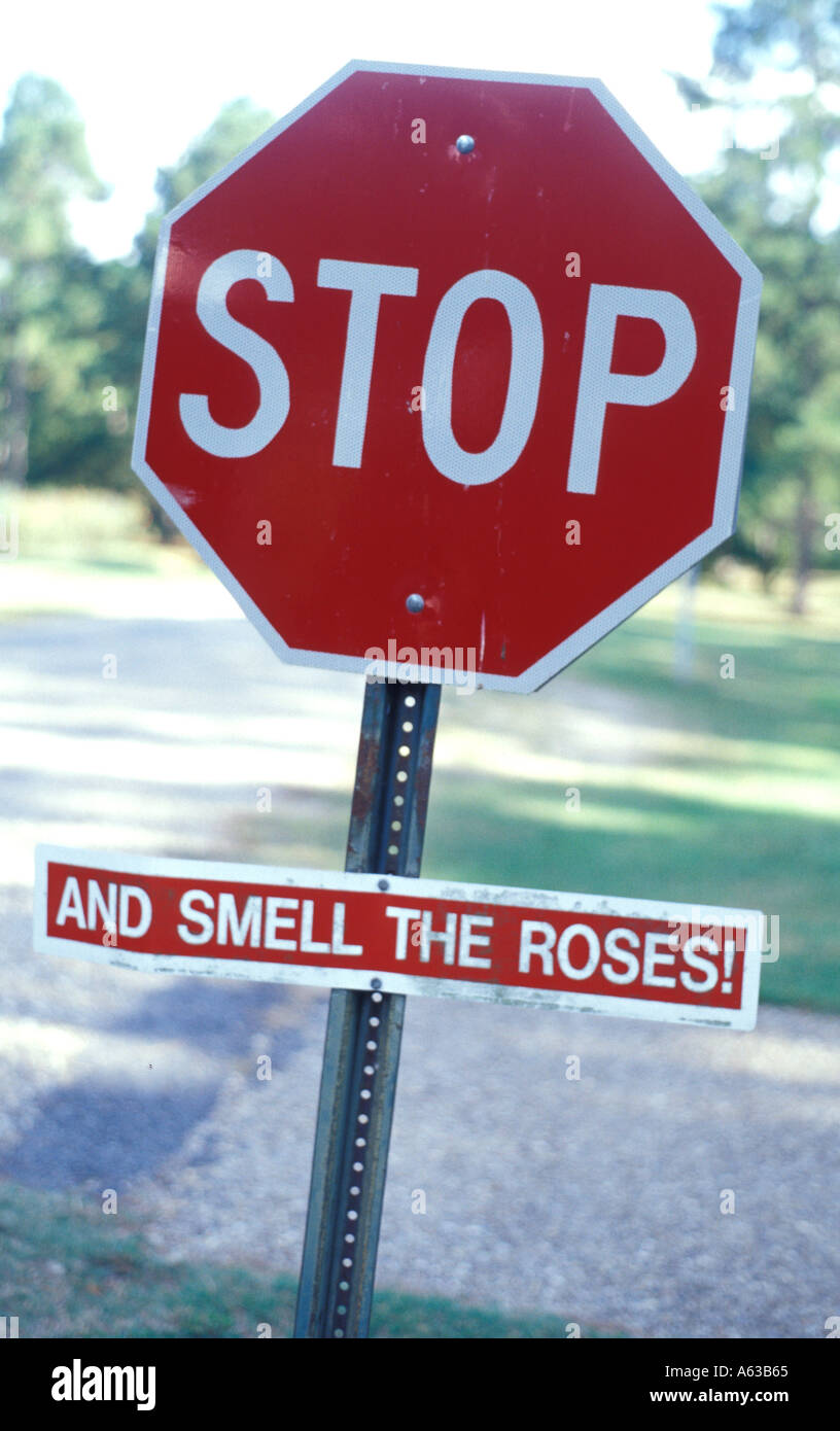 Stop sign with humorous sign added And smell the Roses seen at entrance