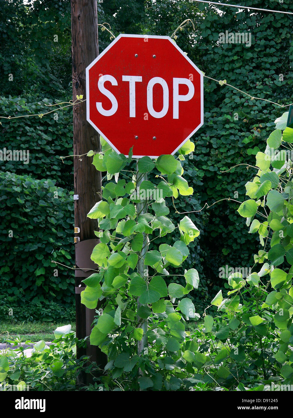 Invasive Kudzu vine entwines a stop sign and adjacent street sign in
