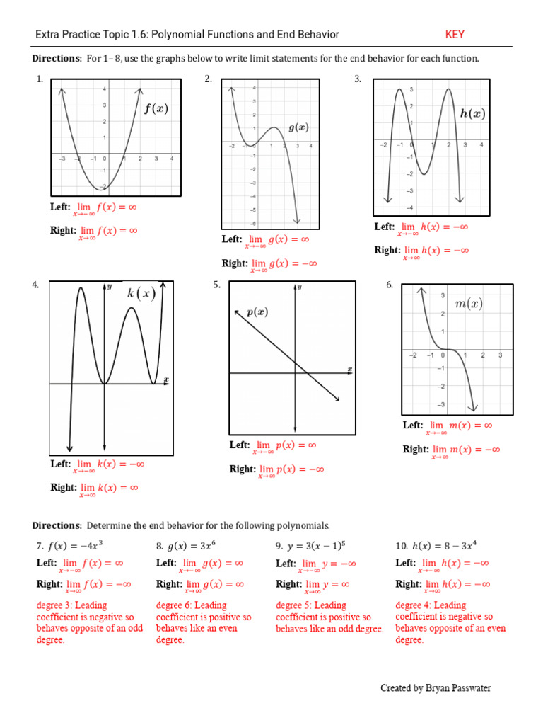 Extra Practice Key Topic 1 6 Polynomial End Behavior PDF Polynomial