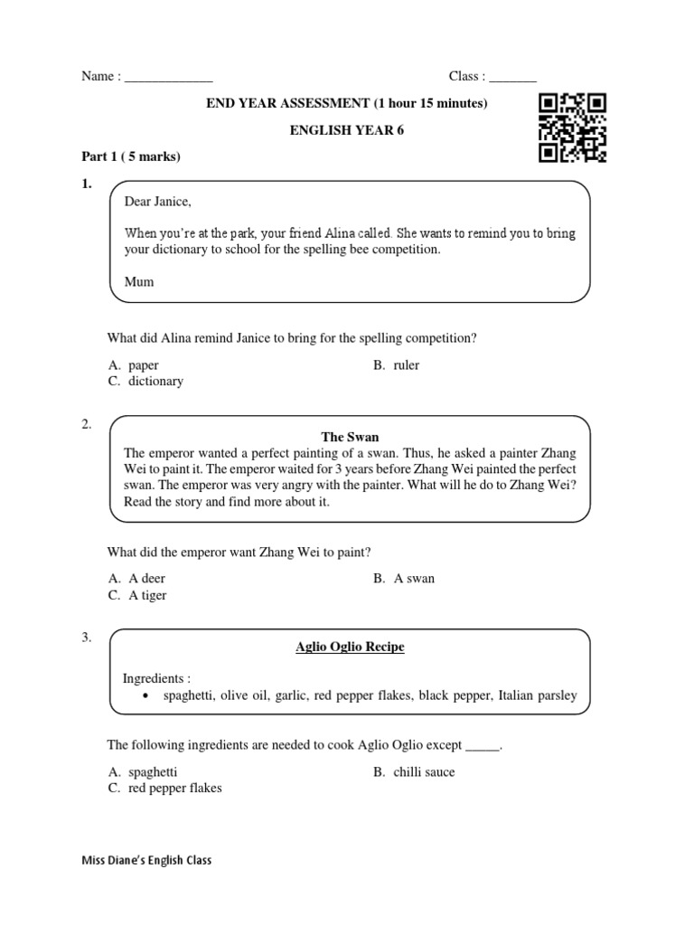 END YEAR ASSESSMENT (1 Hour 15 Minutes) English Year 6 Part 1 (5 Marks