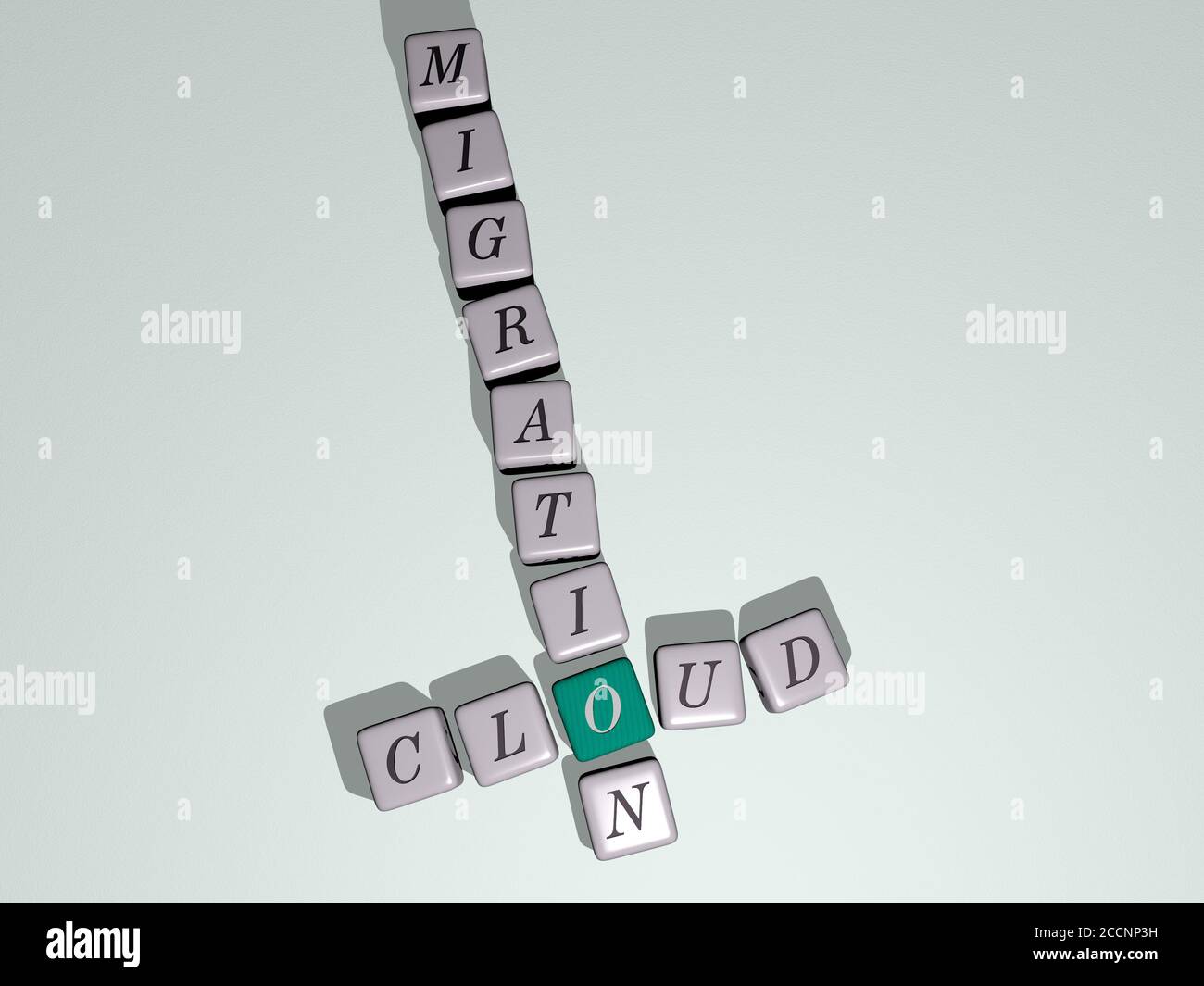 cloud migration crossword by cubic dice letters 3D illustration Stock
