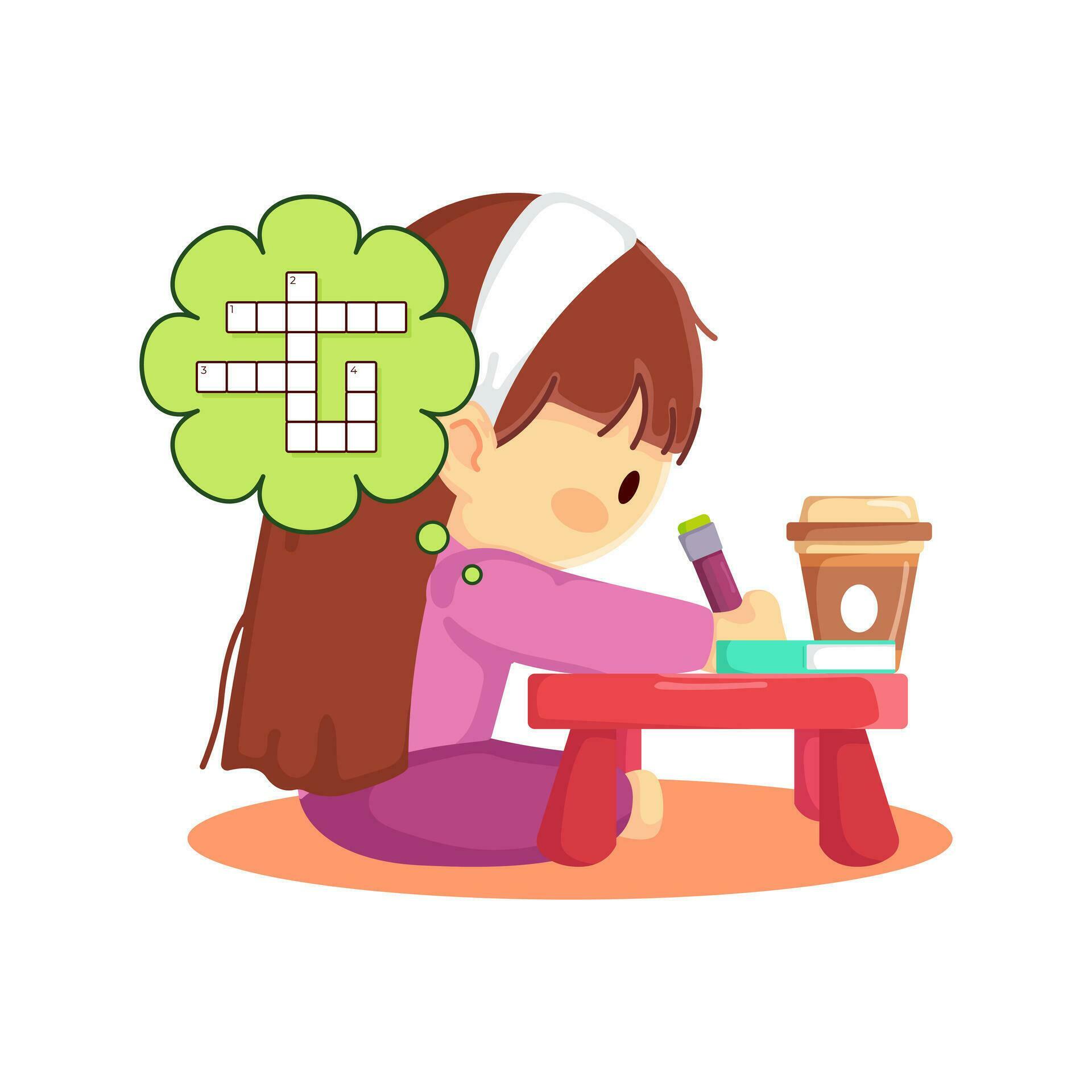 Cute Little Girl Filling Out a Crossword Puzzle while Enjoying Coffee