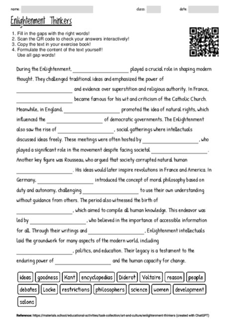 Worksheet with the topic Enlightenment Thinkers MATERIALS SCHOOL
