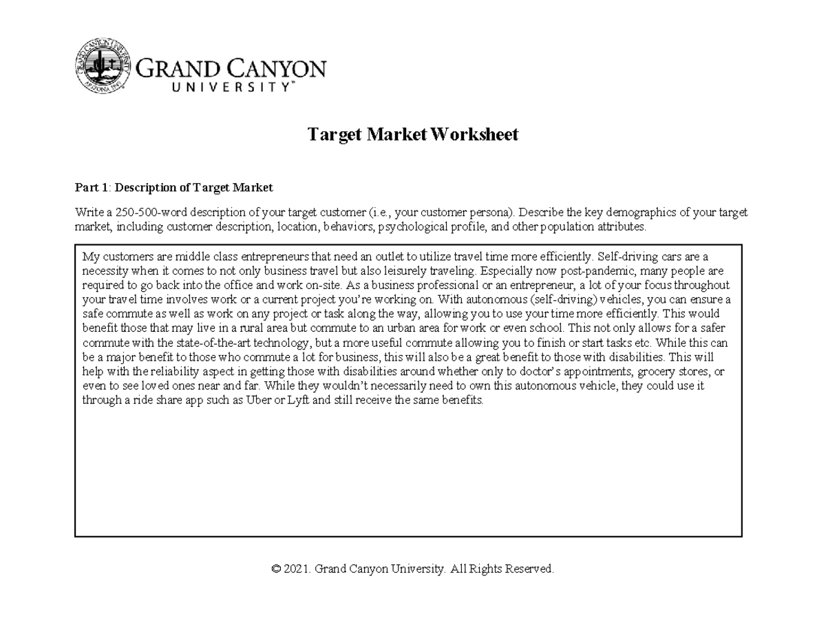 ENT 436 RS T4 Target Market Worksheet © 2021 Grand Canyon University