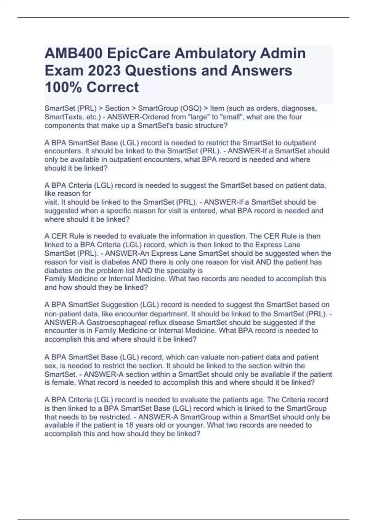 EPIC AMB400 Sample Test Questions With Correct Answers 100% Accurate