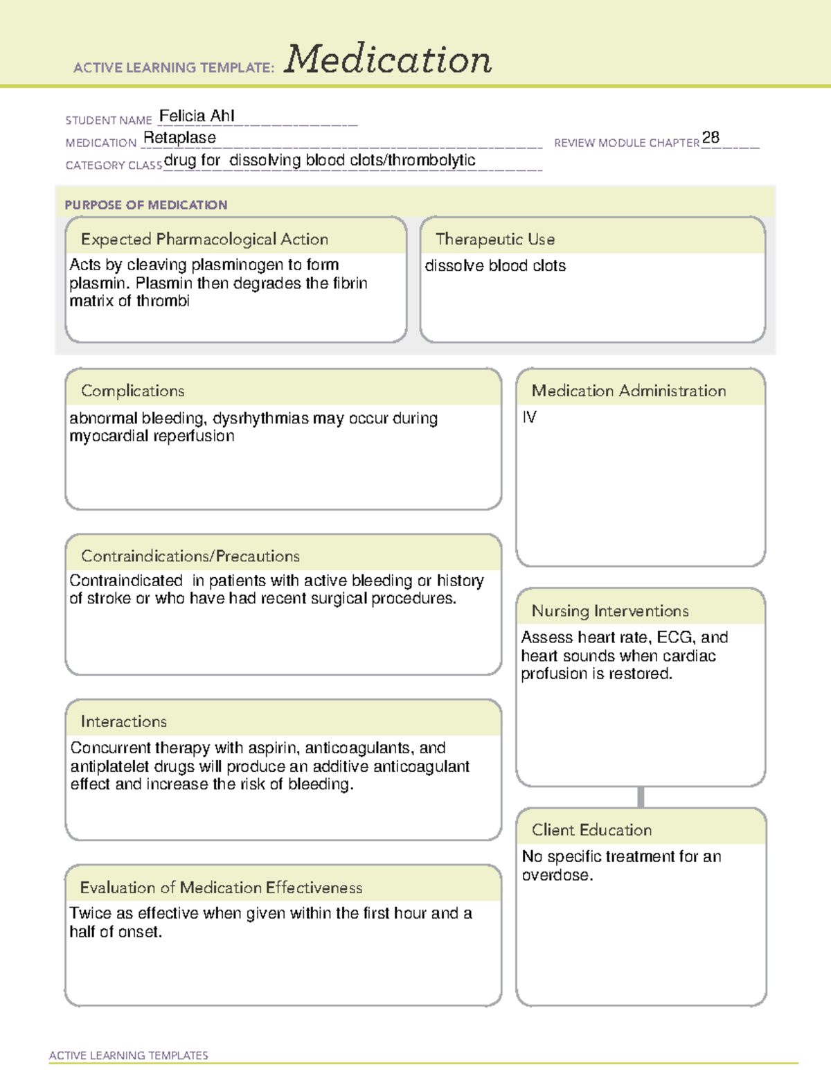 Retaplase drug cards ACTIVE LEARNING TEMPLATES Medication STUDENT