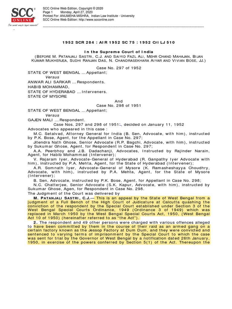 1952 SCR 284: AIR 1952 SC 75: 1952 Cri LJ 510 in The Supreme Court of