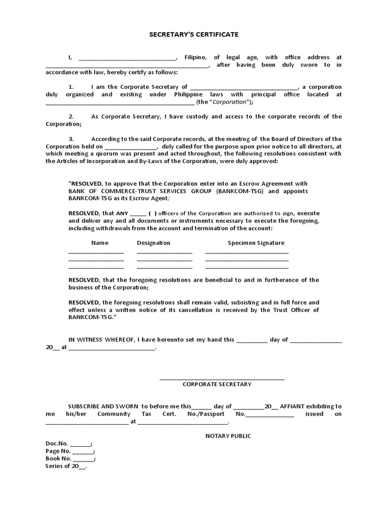 2022 Escrow Secretary #39 s Certificate Download Free PDF Document