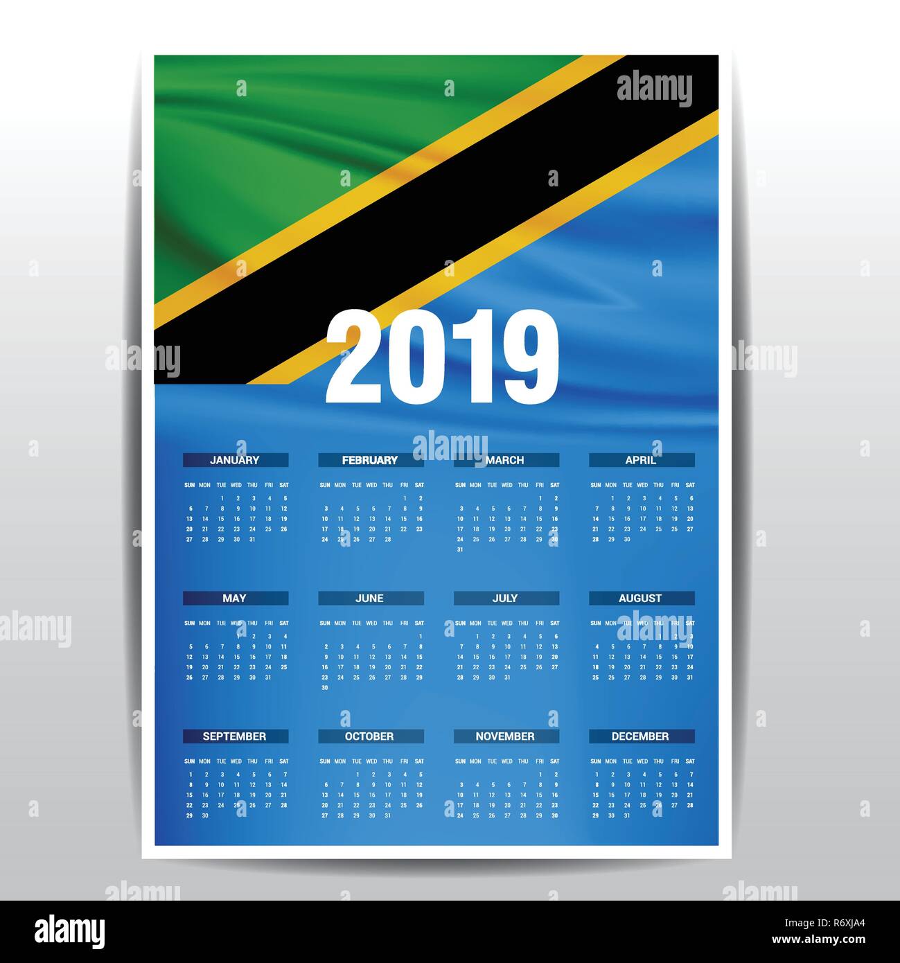 Calendar 2019 Tanzania Flag background English language Stock Vector