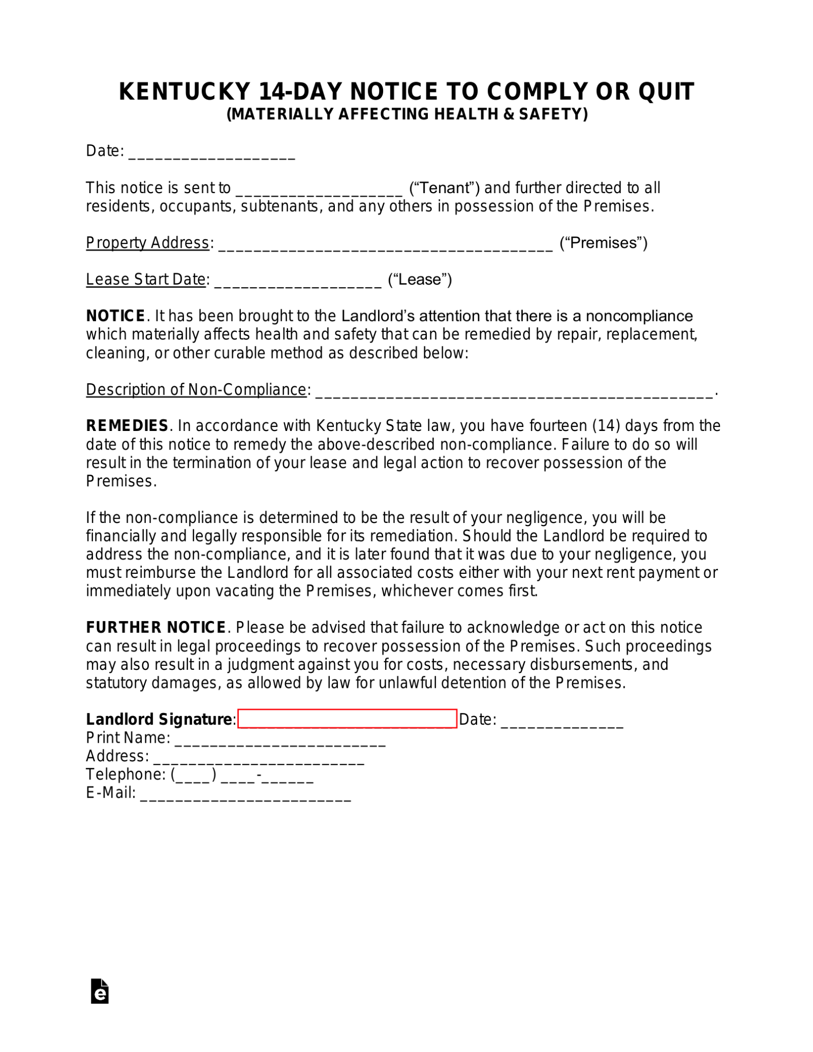 Free Kentucky 14 Day Eviction Notice Non Compliance PDF Word eForms