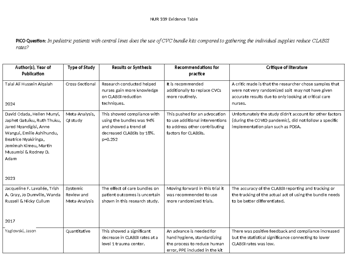 339 Evidence Table Template NUR 339 Evidence Table PICO Question: In