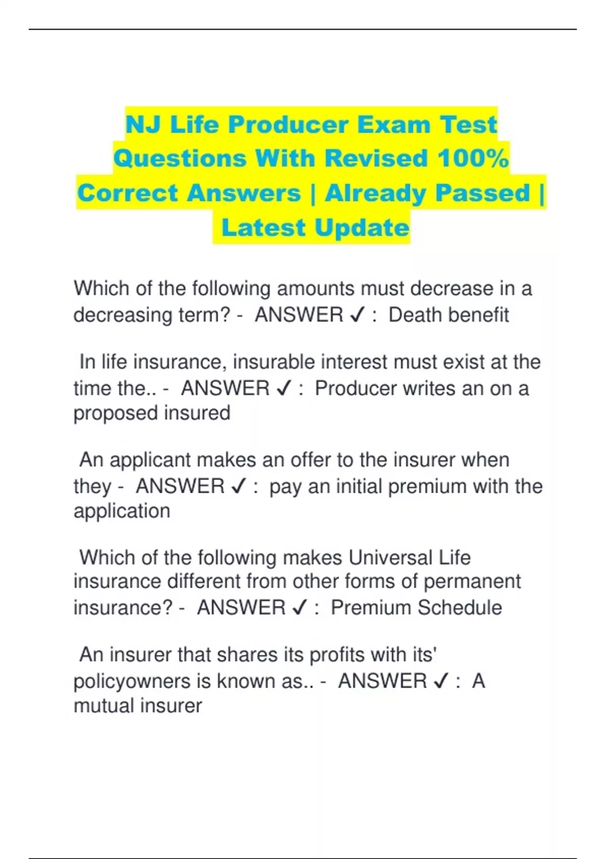 NJ Life Producer Exam Study Life Insurance Correct 100%(rated A) NJ
