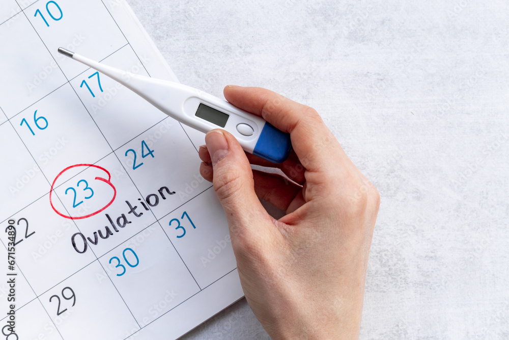 Female period calendar with word Ovulation and thermometer Pregnancy