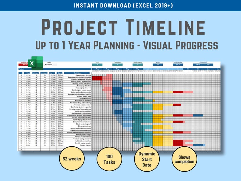 Excel Gantt Chart Timeline Template: Visual Project Tracker (digital