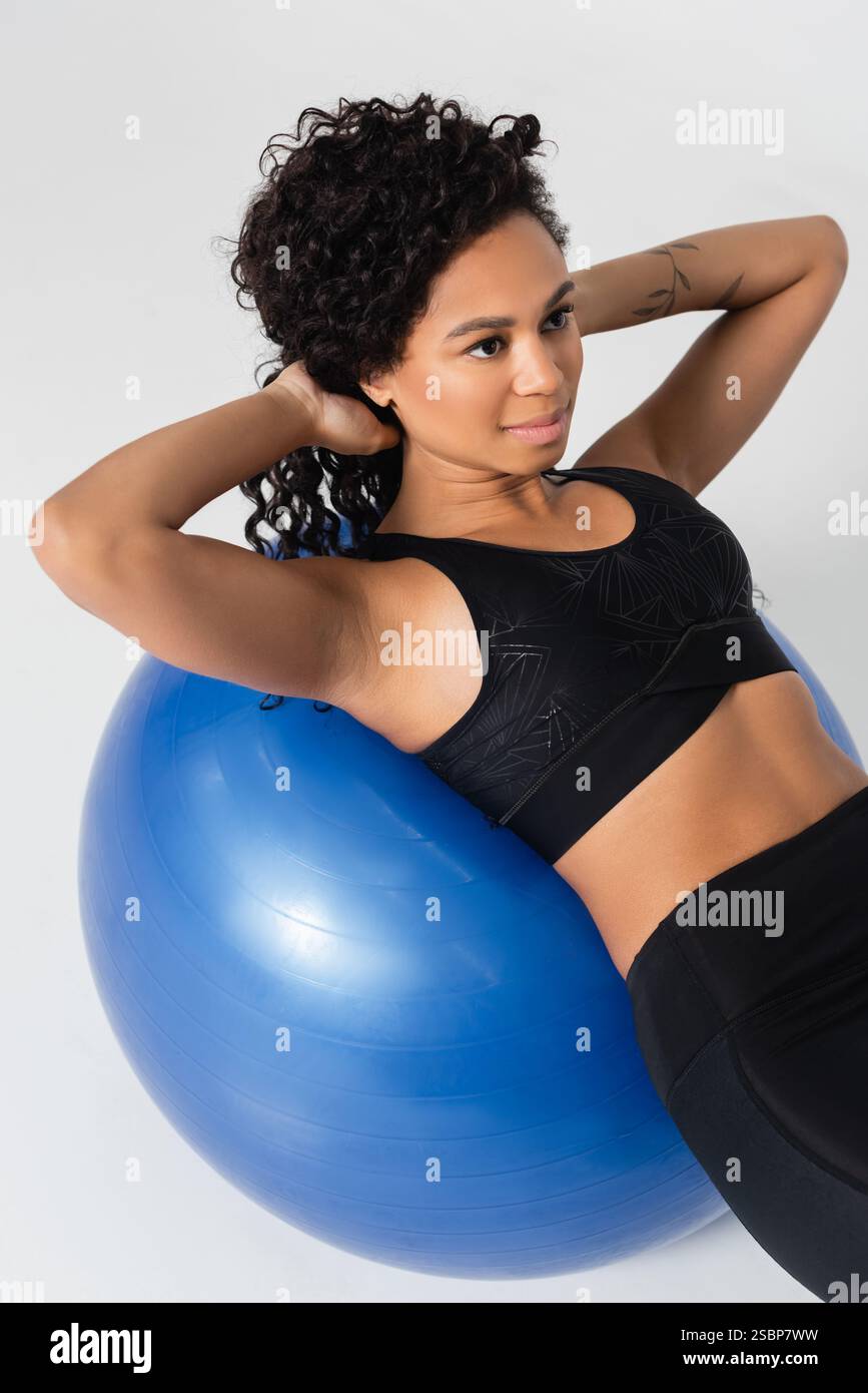 Focused female athlete strengthens her core with an exercise ball in a