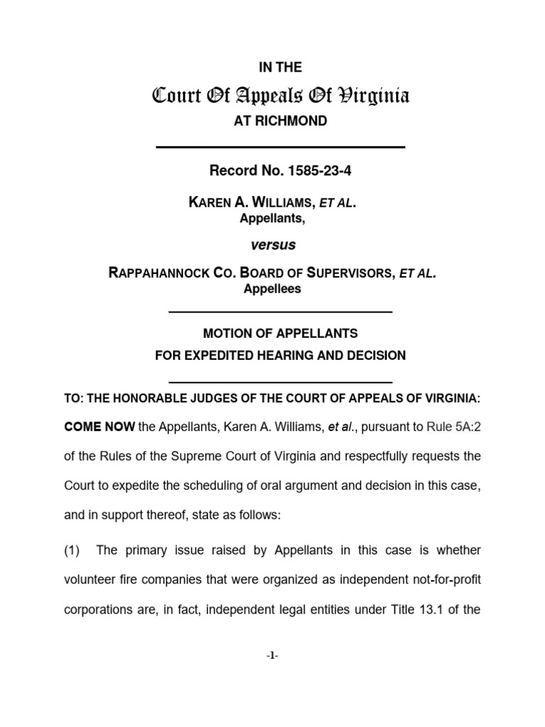 Virginia Court of Appeals Motion For Expedited Hearing and Decision