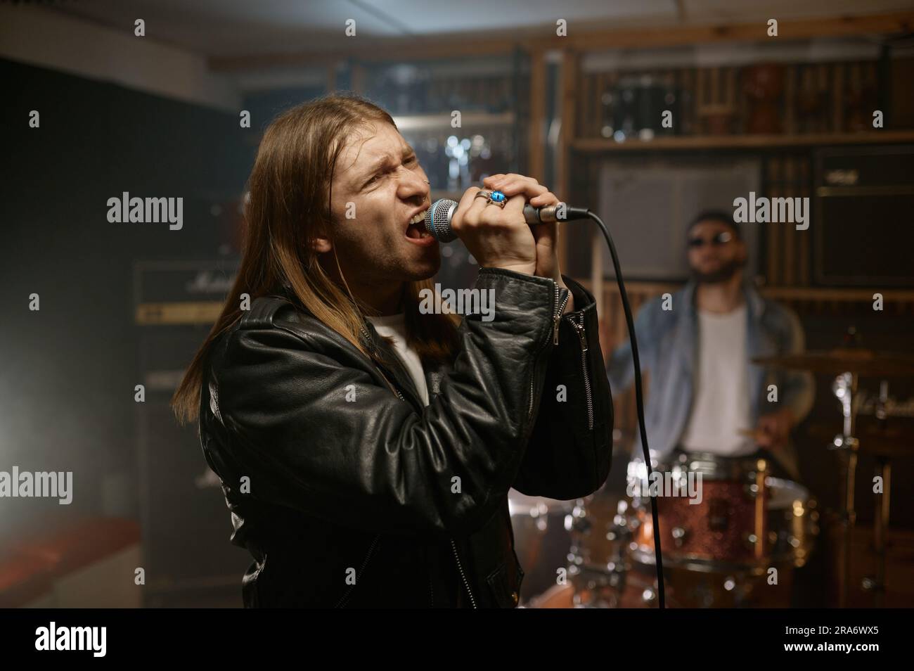 Headshot of expressive rock band soloist emotionally singing lyric song