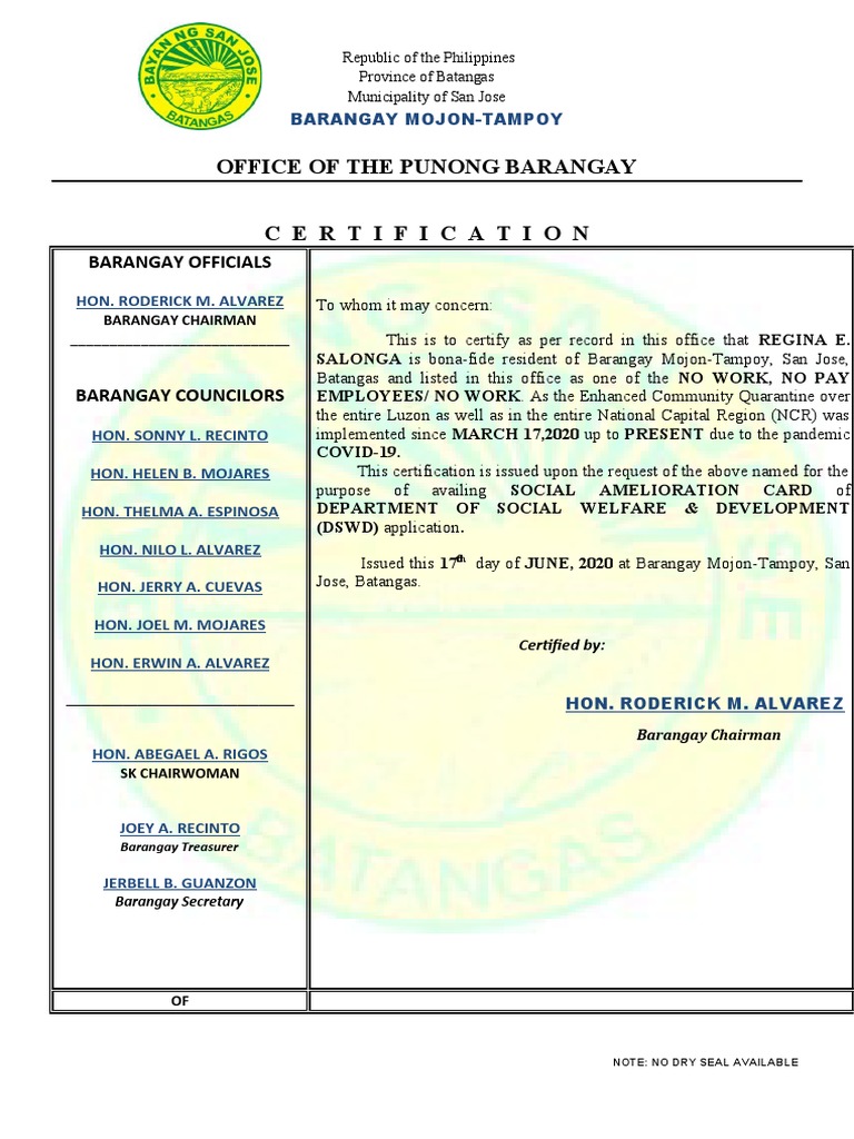 No Work No Pay Certification PDF