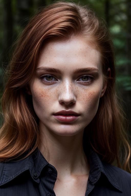 a photo of a seductive woman with loose styled redhead hair posing in