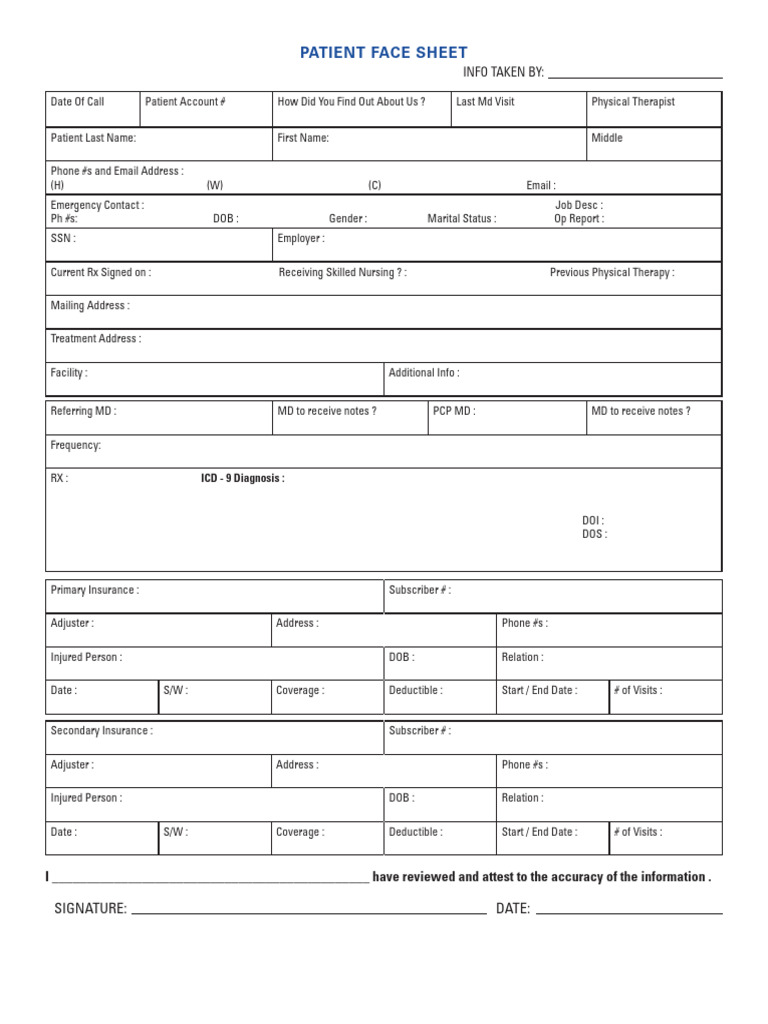 Printable Medical Face Sheet Template