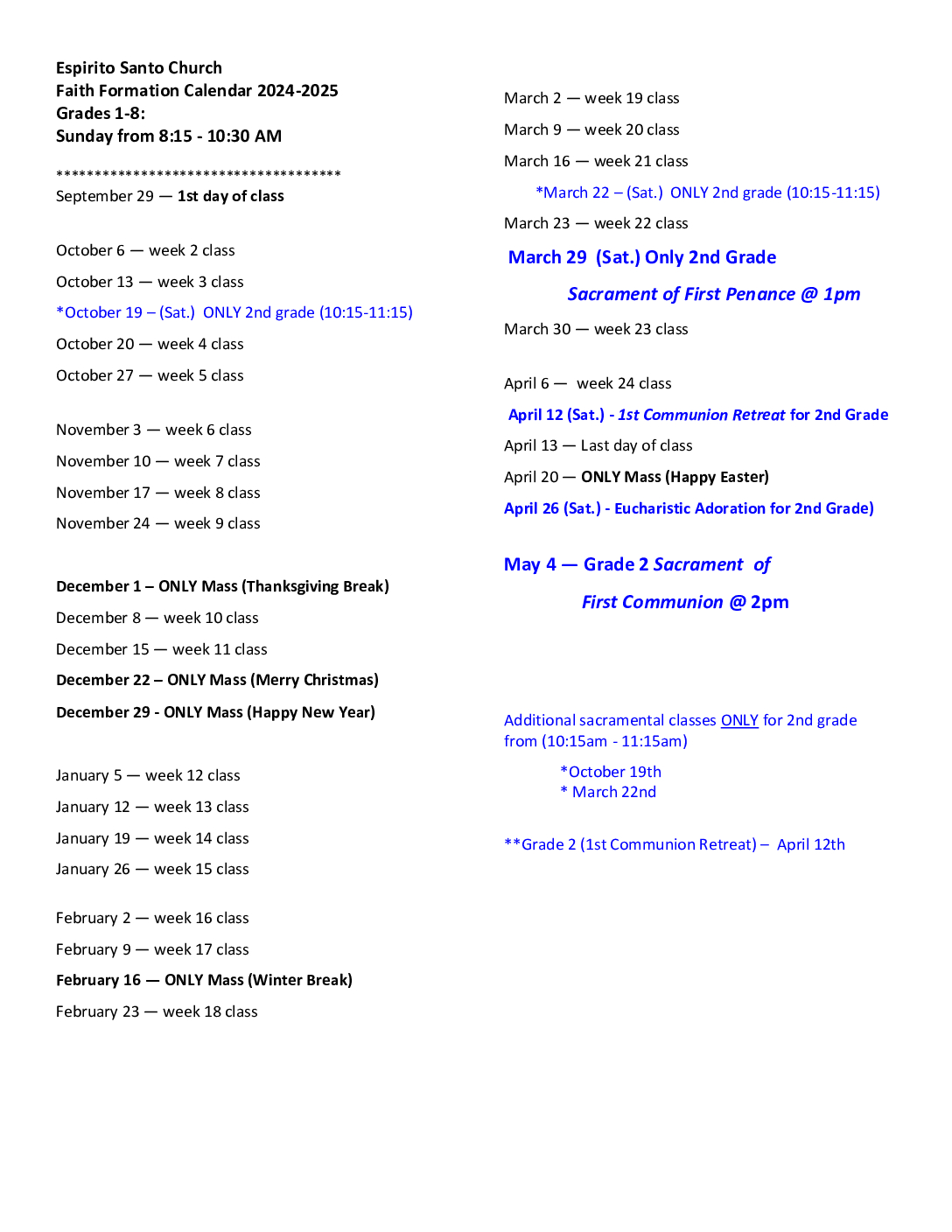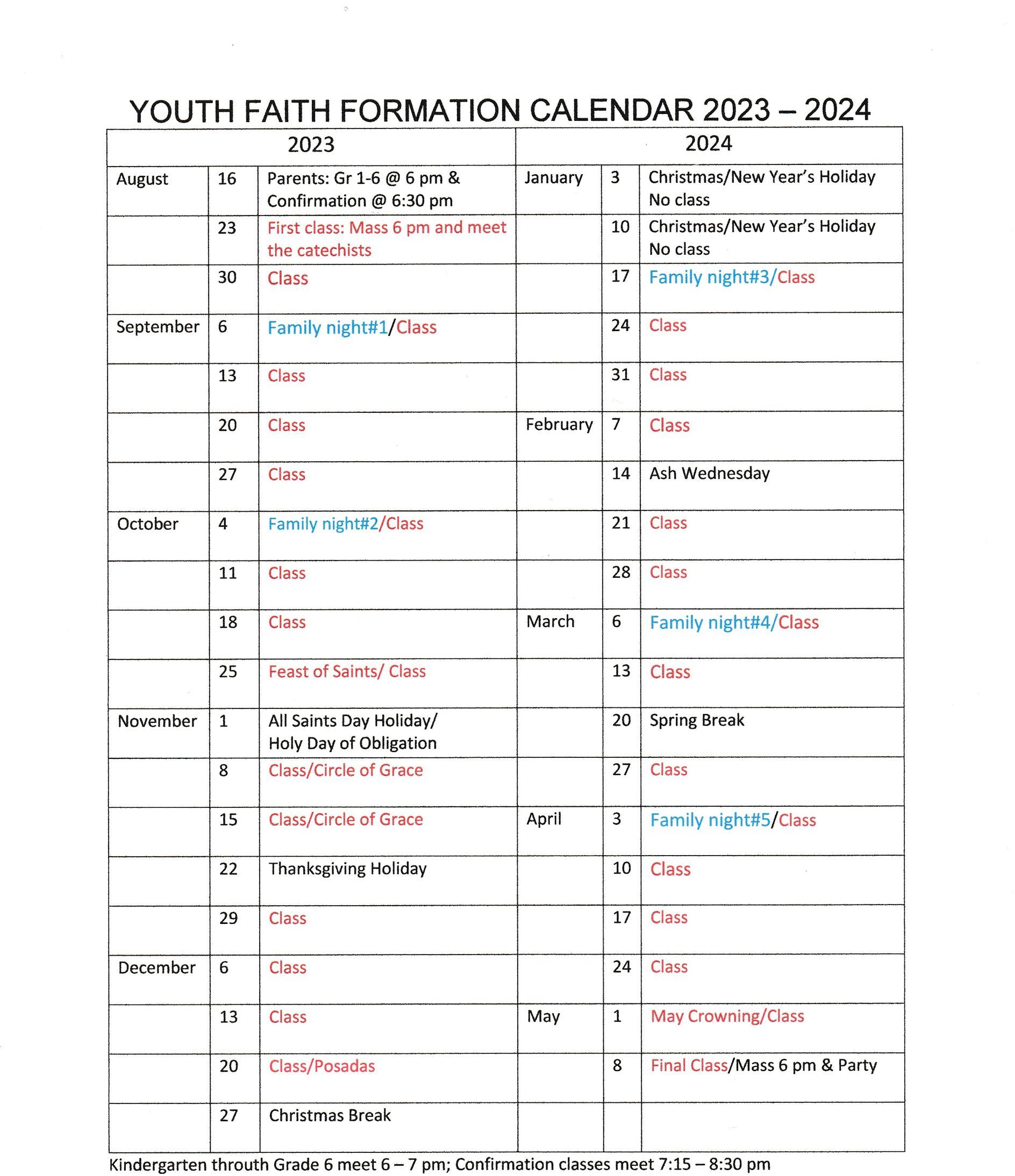 Faith Formation Calendar St Therese Parish